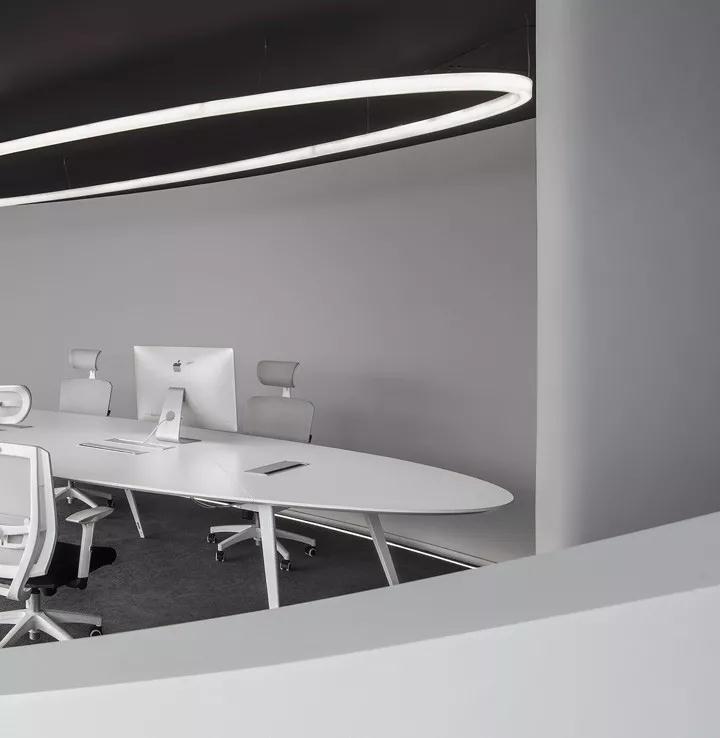 1.首先我們學習寶馬的設計思路,讓空間的訴求進行重新的結構組配,夸大不太好用的弧形空間,使用它本來就有的特點來營造會議和討論區。用相對平直的空間來切分一些必須的深圳辦公室裝修設計。