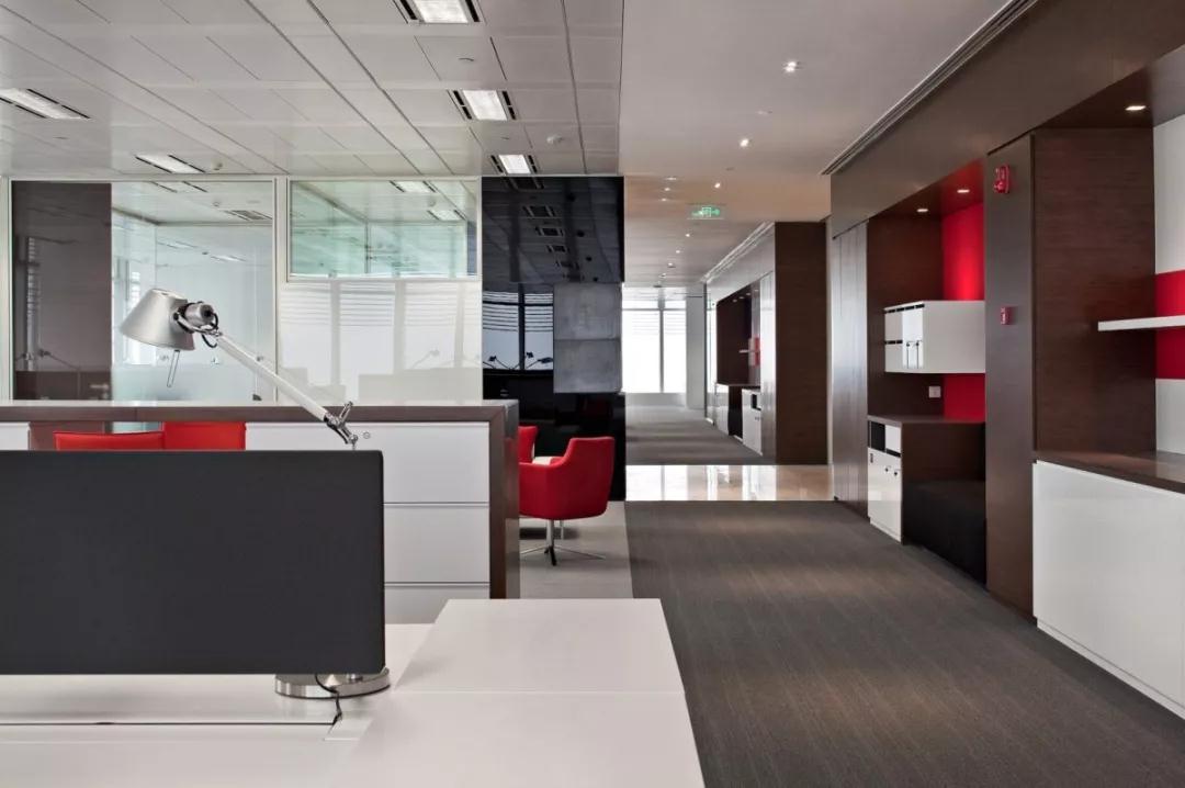裝飾公司在色彩運用上,以銀行的黑、白、灰為主體基調(diào),精心配以匯豐特有的紅色,并以竹木和細絨軟包使空間溫暖、親切,但不失專業(yè)和現(xiàn)代的氛圍。