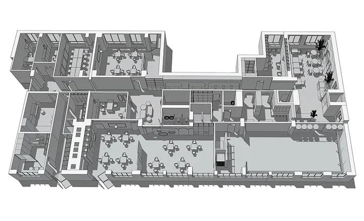 這個500平方米的兒童中心包括以下幾類空間:入口區(qū)包括接待處,迷你咖啡館和主題產(chǎn)品店。該空間還有一條主要走廊,通向建筑物另一側(cè)的出口,貫穿整個中心。
