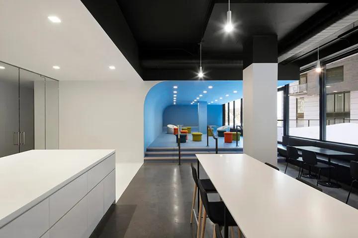 建筑體積為整個(gè)空間帶來(lái)了強(qiáng)烈的運(yùn)動(dòng),而輔助色則增強(qiáng)并定義了每個(gè)工作區(qū)域。為了將安靜的工作區(qū)域與公共區(qū)域區(qū)分開(kāi)來(lái),設(shè)計(jì)團(tuán)隊(duì)使用透明玻璃(有時(shí)是半透明的薄膜)來(lái)分隔空間,同時(shí)保持整體的開(kāi)放感。