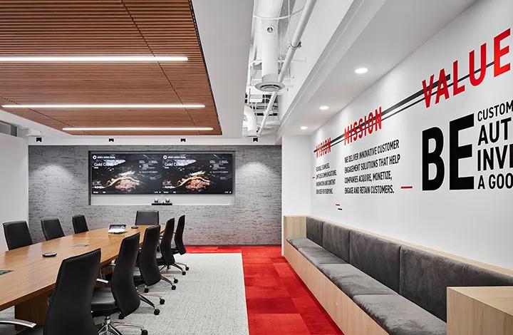 深圳裝飾公司的設計團隊在簡單的走廊和繁忙的會議廳設計鼓舞人心的文字標語和圖形設計;裝飾在明亮,開放的頂表面上的吸音板來自徽標的幾何結構。紅色還用于裝飾開放式辦公室區域的門,家具和天花板。