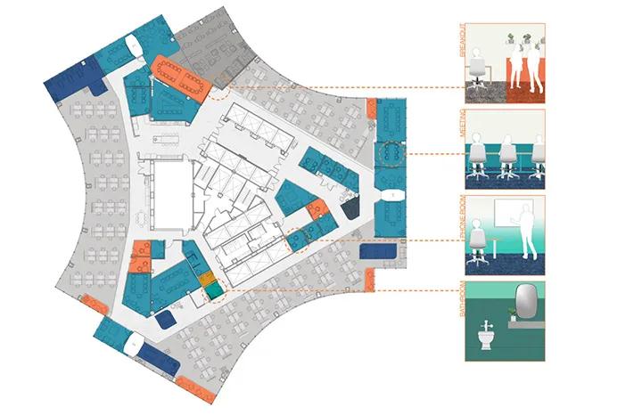 例如,一個供員工使用的大閱覽區位于兩層,設有許多私人休息室,巨大的協作工作臺,各種非正式空間,書架墻和游戲設施。母嬰室還有一個非常重要的功能。在這個多元化而龐大的工作小組中,包括一些即將成為父母的父母和有年幼子女的母親。因此,舒適的家具,天鵝絨窗簾和精美的漸變圖形墻紙經過特殊配置,可為豪華酒店等酒店營造溫暖的空間,并彰顯公司對員工的密切關懷。通過以人為本的精心設計,新擴建的辦公裝修空間不僅可以滿足日常工作流程的流暢性,而且可以為員工創造舒適宜人的工作環境。憑借其充滿活力和多元化的設計熱情,歡迎每位員工以積極熱情的態度投入日常工作。