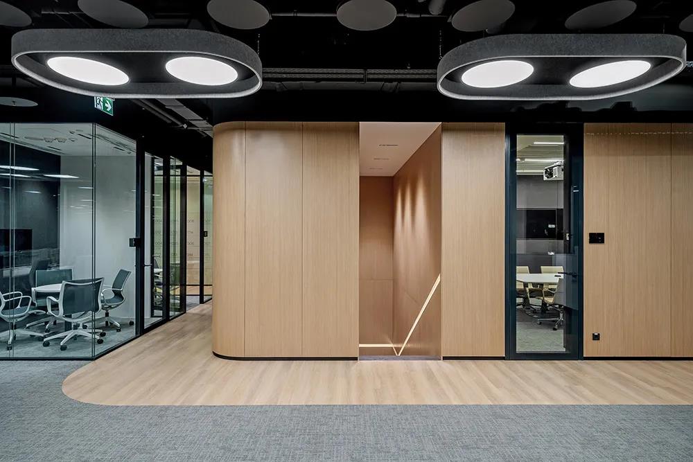 會議室的照明系統采用傳感器進行智能開關控制。深圳辦公室裝修設計流暢的弧線是本案的重要裝飾元素,源自汽車的經典造型結構。極簡色彩搭配黑、白、灰底色,勾勒出精致、簡潔、理性的專業品質空間。溫暖柔和的橡木墻板和部分鋪裝的木紋地板以柔和的淺米色配色融入整體氛圍的營造。軟裝家具的亮色搭配,為開放的工作空間增添了多樣性,豐富了空間視覺。本案深圳裝飾公司所有裝飾材料均取得環保相關證書。