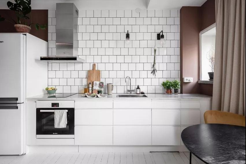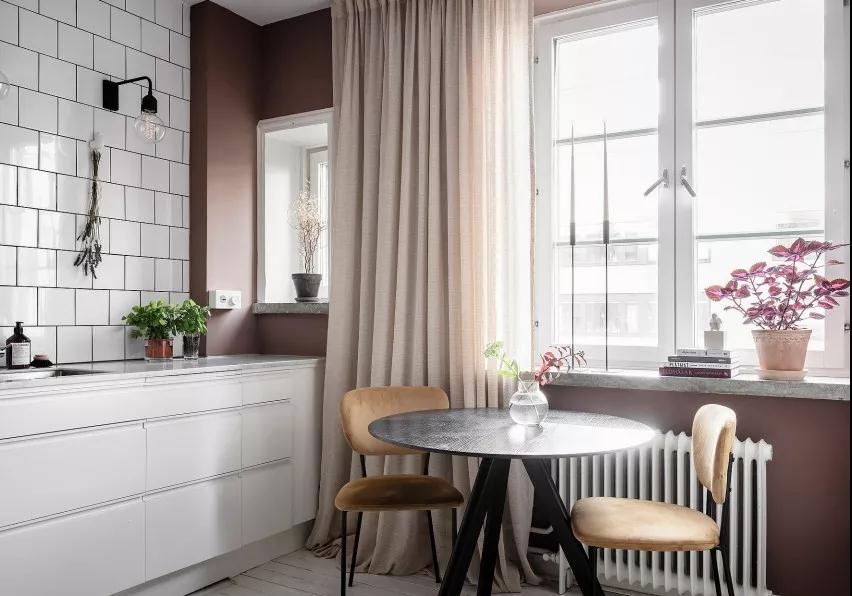 整體墻面漆繪煙熏粉營造輕柔粉嫩氣息,鄰窗處配置低矮餐桌椅使光線自然灑落,相映沙發背墻的大面圓鏡,裝修設計使空間感無盡延展放大,同步考量清潔實用性,烹調區以純白壁磚與櫥柜筑起清爽視感,在可可棕、奶茶粉調的低彩軟件交織之下,體現優雅小空間的舒心情景。