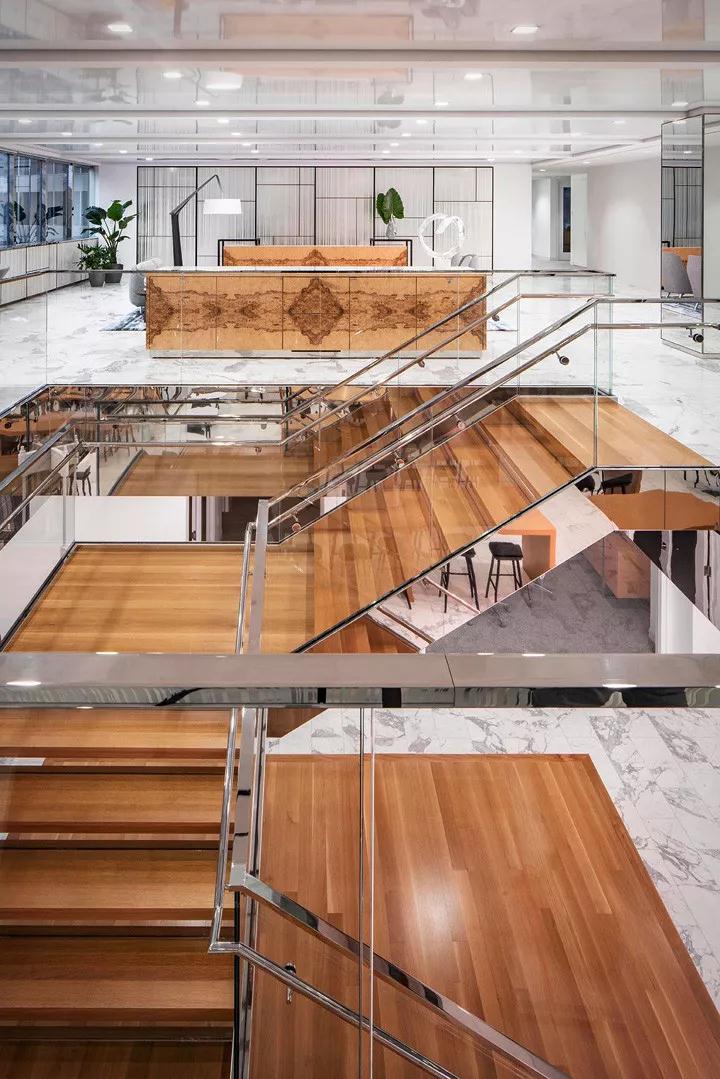 室內裝修以通透的玻璃來制作隔墻,利于光和視線的穿透。黃褐色樹瘤橡木飾面板制作的接待前臺也是本案的一大看點,均衡對稱的蝴蝶紋樣的木紋圖形帶來戲劇化的視覺效果,猶如一張代表公司形象的藝術名片,令人為之驚嘆。